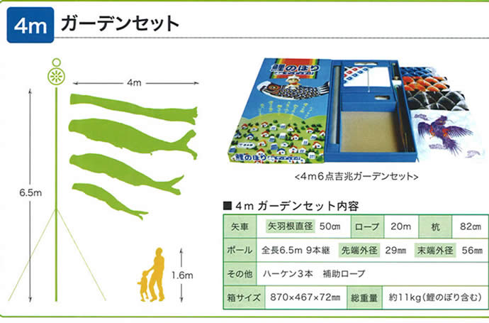 吹流し4m/黒鯉4m/赤鯉3m/青鯉2m/緑鯉1.5m/矢車 矢羽根直径50cm/ロープ20m/ポール6.8m矢車・ロープ・ポール・吹流し・黒鯉・赤鯉・青鯉・緑鯉軽量で簡単に狭いスペースにも設置が出来て、サイズは小さめでお手軽、でも内容は大型鯉のぼり並に本格的なもので充実したセットです。