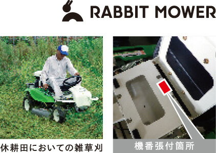 製品出荷時/オイル&燃料状態 品 名 容量 注油 ミッションオイル(#90) 1.0リットル 済 HSTオイル(#46) 0.5リットル 済 エンジンオイル(#30) 2.0リットル 済 ガソリン(無鉛) 12.0リットル 少量入 品 名 ラビットモアー 型 式 RM951A 全長×全幅×全高(mm) 1,895×1,040×870 総重量 283 本 体 車速(km/h) 前進:(高)0〜10.0(低)0〜6.7/後進:(高)0〜7.0(低)0〜4.7 能率(反/時間) 0〜9.6(直線刈最大時) 車 輪 前輪:3.50-7(直径350)後輪:16×7.00-8(直径400) ハンドル上下 丸ハンドル(3段調整)前後チルト無段階 走行クラッチ HST方式 ベルト(走行) LB32(AG-X以上)×1本 シートスライド、カバー簡単開閉 作業部 刈幅(mm) 950 刈高(mm) 10〜70(無段階アシスト付) ナイフ ナイフステー×1連/フリーナイフ×2枚 ベルト(刈取) LB78(AG-X以上)×1本 作業クラッチ ベルトテンション エンジン 型 式 カワサキ/FS541V-AG82 最大出力kW(ps) グロス:13.4kW(18.0ps)排気量:603cc 油量/燃料 (E)2.0リットル/(G)12.0リットル E/GコードNo. 9024-0010 製品コードNo. 0343-0010
