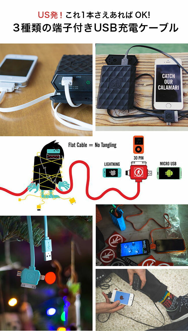 【30%OFF】OUTDOOR TECH アウトドアテック カラマリ 充電コード 充電ケーブル 端子 3種類 3way 3-in-1 iPhone GALAXY Nokia iPad 携帯 Android 30pin マイクロUSB Lightning8pin LA発 日本上陸 Calamari