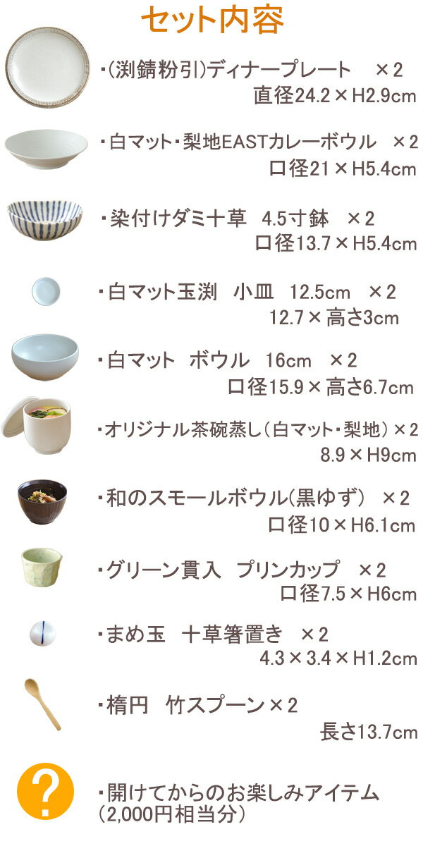 セット内容 【食器】 ・(渕錆粉引)ディナープレート ×2 ・白マット・梨地EASTカレーボウル ×2 ・染付けダミ十草 4.5寸鉢 ×2 ・白マット玉渕 小皿 ×2 ・白マット ボウル ×2 ・オリジナル茶碗蒸し(白マット・梨地) ×2 ・和のスモールボウル(黒ゆず) ×2 ・グリーン貫入 プリンカップ ×2 ・まめ玉 十草箸置き ×2 ・楕円ナチュラルスプーン(竹) ×2 ・お楽しみ商品 (2,000円相当分) ×? 商品詳細 【食器】 素材/磁器 生産地/日本(美濃焼) 電子レンジ、食器洗い機使用可 オーブン(直火)不可 【竹スプーン】 素材/竹 ウレタン塗装 生産地/中国 ※サイズは全て外寸になります。